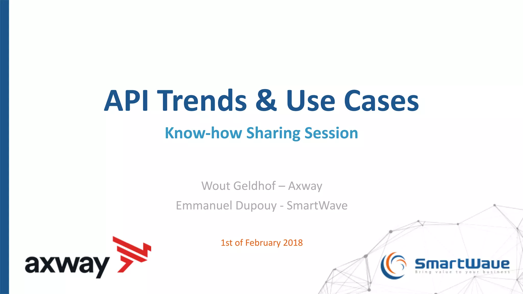 This document summarizes an API trends and use cases presentation given by Wout Geldhof from Axway and Emmanuel Dupouy from SmartWave. It discusses how APIs have become ubiquitous due to digital transformation needs. Typical integration use cases presented include API gateways for security, service brokers for cloud integration, API governance for developer onboarding, and token mediation for authentication. Case studies demonstrate API solutions for digitalizing customer relationships, securing government access, and migrating services from an ESB to an API gateway. Challenges discussed include ensuring API management is suitable for any integration case and requiring new competencies to manage APIs.