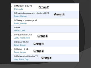 This document provides information about the International Baccalaureate (IB) and Advanced Placement (AP) programs available at the school. It introduces the IB and AP coordinators and counselors who can provide guidance to students. While general information about the programs is provided, specific course selections will be addressed individually with students starting in February. Both IB and AP offer rigorous academic courses that can earn students college credit. The document discusses the benefits of each program and stresses that admissions officers view them equally. It provides details about the course offerings and requirements for the IB Diploma Program and certificates.