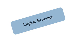 This document provides information about the surgical procedure of apicoectomy. It begins with an introduction defining apicoectomy as the surgical resection and removal of the root tip and pathological periapical tissues. It then lists the indications and contraindications for the procedure. The rest of the document details the armamentarium, surgical technique including designing the flap, localizing and exposing the apex, resection of the apex, retrograde filling if needed, and wound closure. The surgical technique section provides step-by-step details of each part of the procedure.