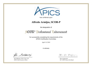 This document certifies that Alfredo Armijos has earned the designation of SCOR-P (SCOR Professional Endorsement) from APICS (Association for Supply Chain Management) for successfully completing the requirements set by APICS' Certification Committee. The certification is signed by Abe Eshkenazi, APICS Chief Executive Officer, and Steve Georgevitch, 2017 APICS Chair of the Board, and is dated April 19, 2018.