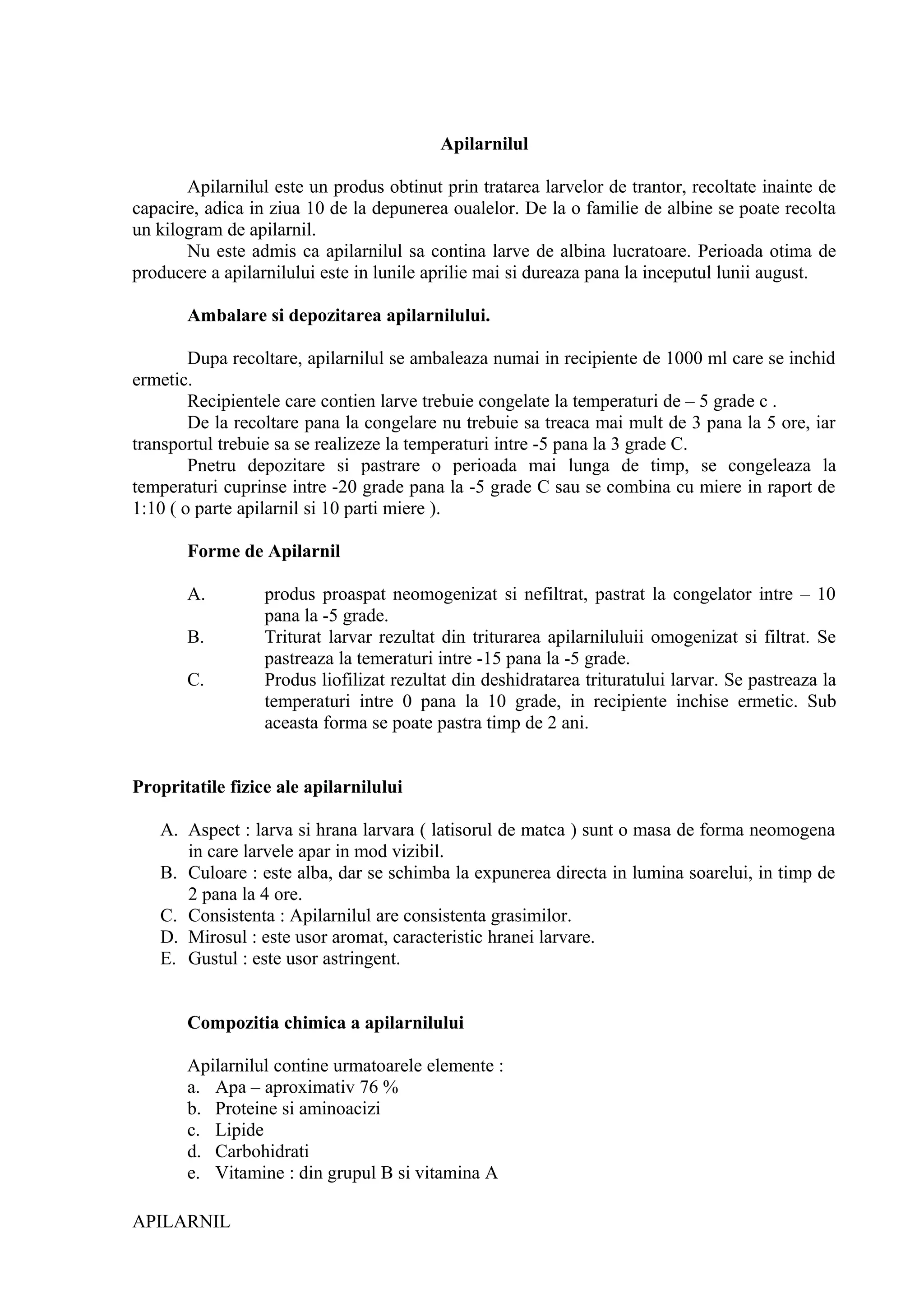 Apilarnilul este un produs obținut din larvele de trantor, recoltate înainte de capacire, și are multiple forme de utilizare, inclusiv proaspeți, triturat sau liofilizat. Acesta conține o varietate de nutrienti esențiali și are proprietăți nutriționale și terapeutice, fiind util în tratamente pentru diverse afecțiuni, dar având și contraindicații. Modurile de administrare includ solutii, comprimate sau aplicatii externe, iar doza zilnică variază în funcție de vârstă și scopul utilizării.