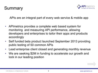 APImetrics provides a web-based system for monitoring and measuring API performance. It has launched a beta product and generated monthly revenue from an enterprise client. The company is seeking $2 million in funding to accelerate growth and solidify its leading position in API performance monitoring. It aims to expand its user base and offerings to become the dominant third-party service for API monitoring.