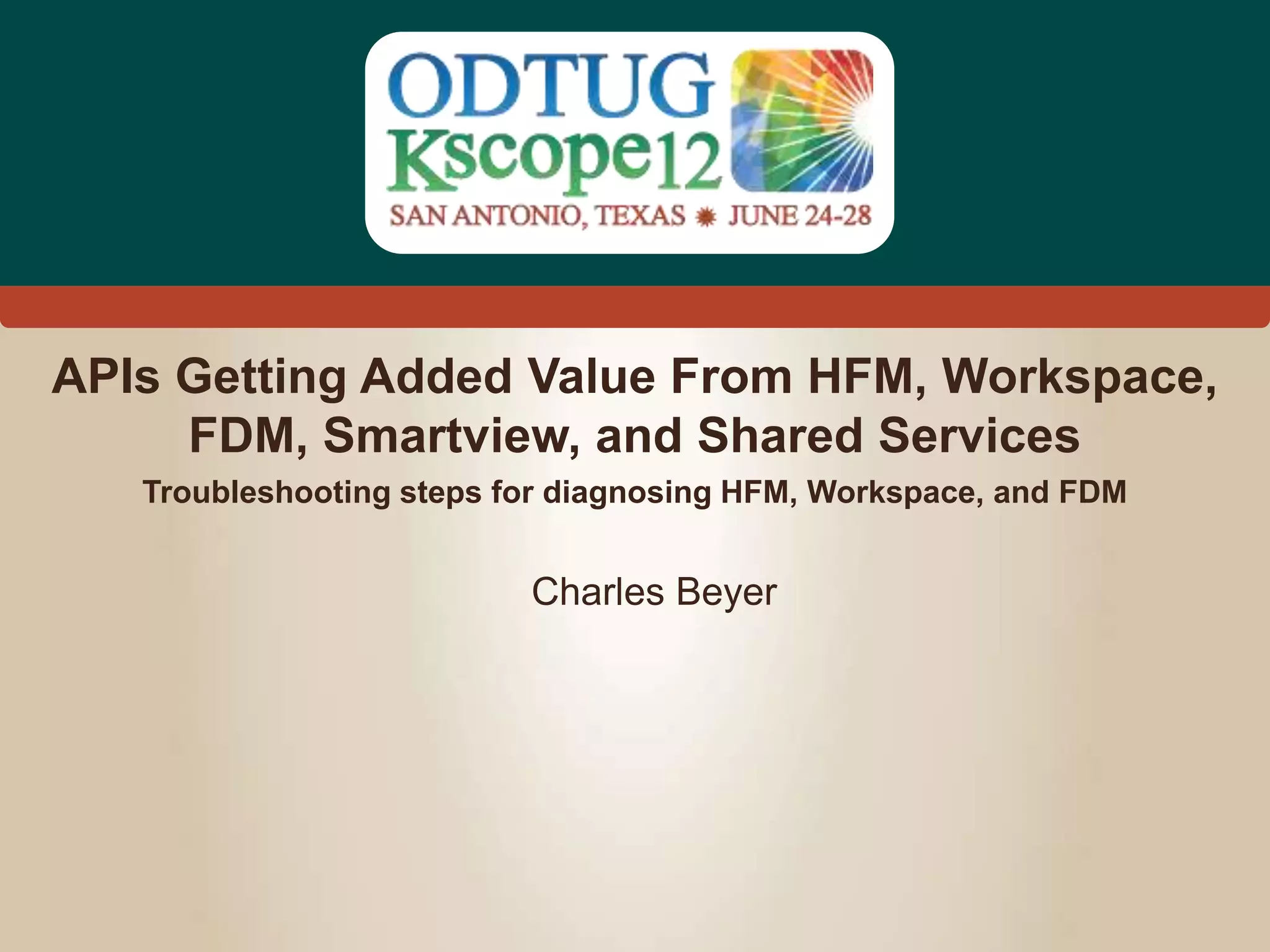 The document outlines a presentation by Charles Beyer, detailing the utility of various EPM API libraries including HFM, FDM, Smart View, Workspace, and Shared Services for enhancing development workflows. It provides troubleshooting tips, API overviews, sample programs, and prerequisites for each API, emphasizing the benefits and features they offer. The session aims to demystify APIs, demonstrating their role in speeding up development, reducing errors, and extending product functionalities.