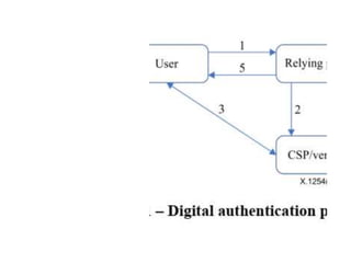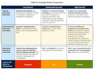 The document outlines an agenda covering various topics related to digital identity and authentication. It discusses entity identity, assurance frameworks, the digital authentication process flow, threats/risks/controls, strong authentication methods, token and credential management standards like JWT, OAuth 2.0, OpenID Connect, FAPI, and how they relate to identity in areas like banking and payments. It provides definitions for key terms and compares authentication flows using standards like SAML, OAuth and OpenID Connect.