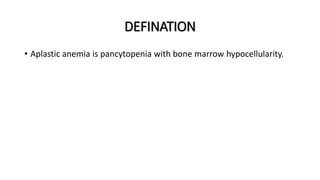 This document discusses aplastic anemia, a condition characterized by pancytopenia and bone marrow hypocellularity. It defines aplastic anemia, discusses its causes (acquired from things like radiation, drugs, viruses, immune diseases, or inherited genetic syndromes), epidemiology, pathophysiology, clinical features including symptoms and examination findings, diagnostic testing including blood tests and bone marrow biopsy, and treatment options including hematopoietic stem cell transplantation, immunosuppression, supportive care, and prognosis.