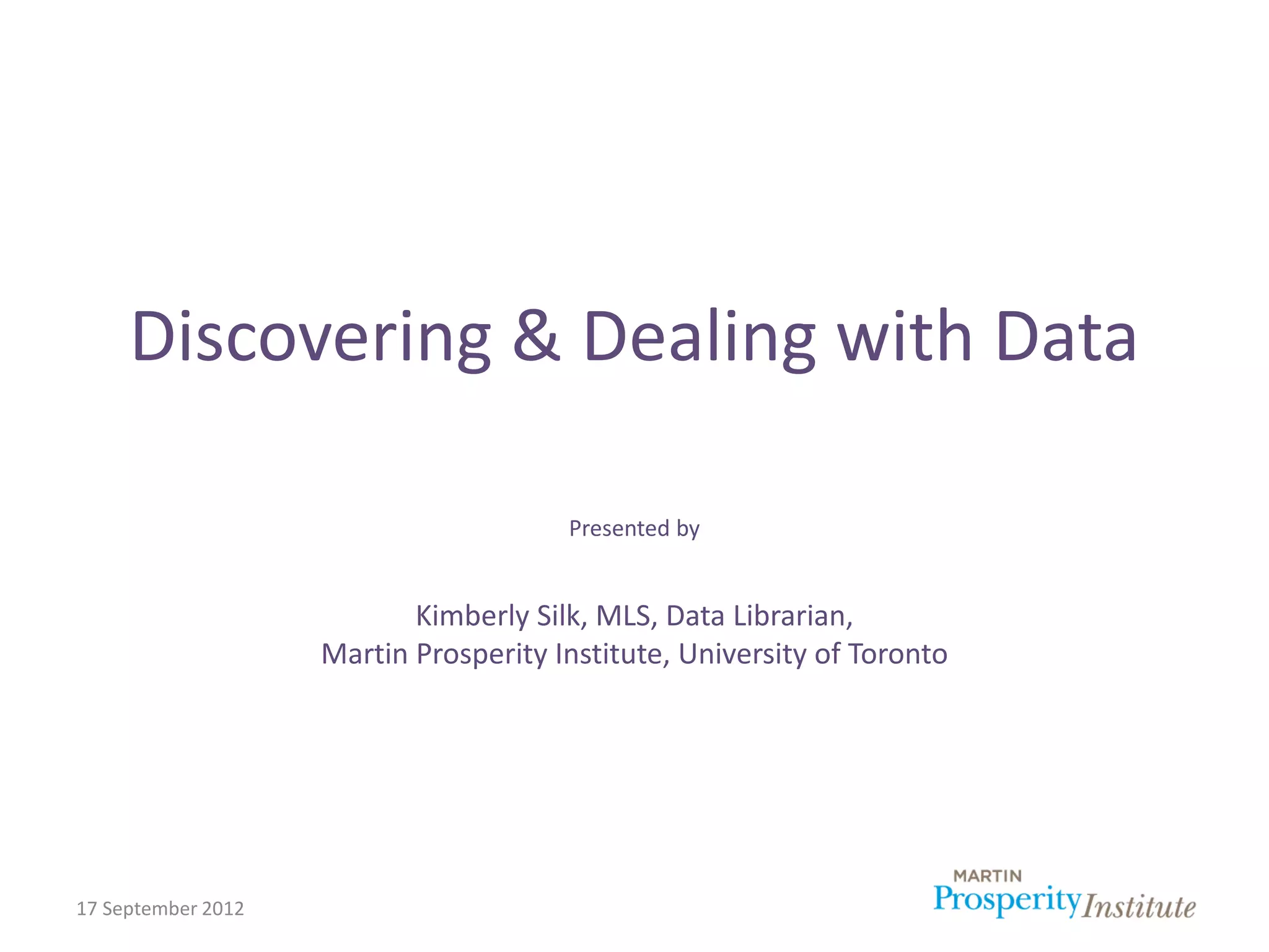 Kimberly Silk presented on data management and discovery at the Martin Prosperity Institute. The MPI collects large social science datasets from various common and authoritative sources to support research. To better organize their growing collection, the MPI implemented an open data discovery platform called Dataverse to catalog and provide access to their datasets. Open data initiatives aim to make certain government data freely available to the public, but also present challenges around data preparation, support, and responsiveness. Big data refers to extremely large datasets beyond the capabilities of typical database tools, and data visualization is an important way to communicate insights from data.