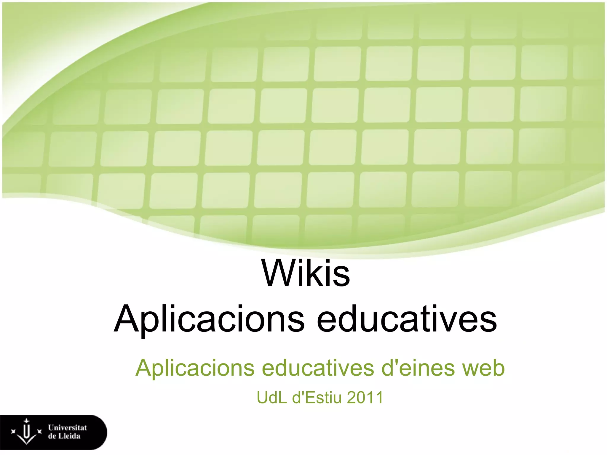 Eduwikis Wikis aplicadesa l’educació, fonamentalment per a la construcció colaborativa de coneixement. El coneixement generat no serà provablement el millor coneixement que hi hagi, però serà el millor que colaborativament poguem generar