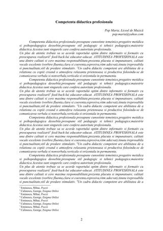 Documentul analizează competențele didactice profesionale necesare unui cadru didactic, subliniind importanța cunoștințelor temeinice, pregătirii metodice și abilitatății de a crea o atmosferă prietenoasă și productivă în clasă. Se discută despre avantajele și dezavantajele utilizării tehnologiilor informației și comunicației în procesul educațional, precum și despre impactul pe care acestea îl au asupra elevilor și profesorilor. De asemenea, se menționează importanța atitudinii profesionale, includerea feedback-ului și echilibrul între informative și formativ în educație.