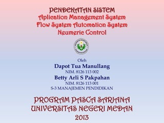 Dokumen ini membahas tentang sistem manajemen aplikasi dan otomatisasi, menjelaskan langkah-langkah penerapan dan pentingnya kolaborasi dalam mencapai tujuan organisasi. Sistem dijelaskan sebagai himpunan komponen yang saling terhubung untuk mencapai tujuan tertentu, serta karakteristik dan alat yang digunakan dalam manajemen sistem. Terdapat juga pembahasan mengenai keuntungan dan kerugian penggunaan pendekatan sistem dalam organisasi.