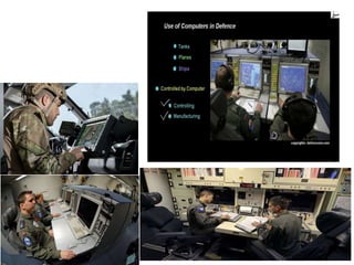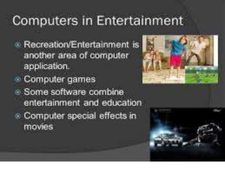 Computers have revolutionized education by allowing for more interactive and tailored learning experiences for students. They can be found in classrooms, libraries, and museums providing educational resources. Computers also help businesses with tasks like payroll calculations, financial forecasting, and managing employee databases. In medicine, computers are used for imaging techniques, monitoring patients, and researching new vaccines and disease diagnostics. Computers further support communication through email and video conferencing, allowing people to connect across distances.