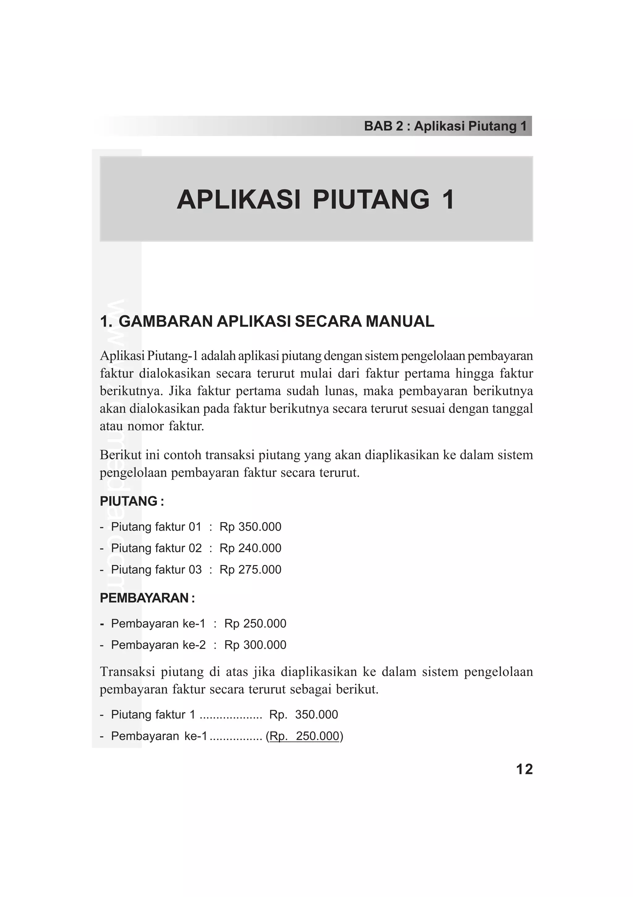 Bab 2 menjelaskan tentang Aplikasi Piutang-1 untuk mengelola transaksi piutang secara teratur dimulai dari tagihan tertua. Terdapat penjelasan tentang pengaturan aplikasi seperti mengisi data perusahaan, menentukan kelompok umur piutang, dan mengisi transaksi piutang pelanggan ke dalam lembar kerja.