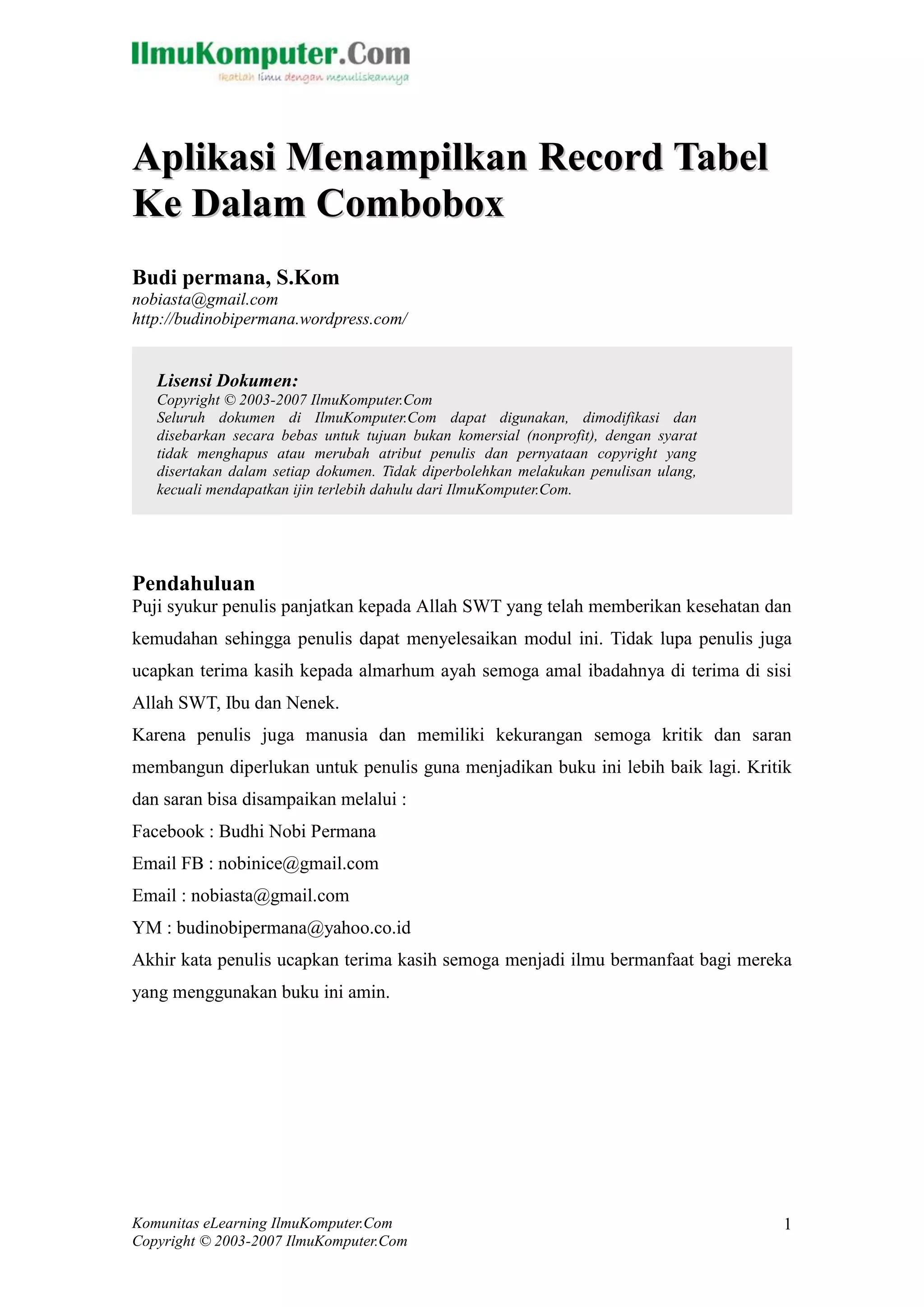 Dokumen ini adalah panduan untuk membuat aplikasi yang menampilkan record tabel ke dalam combobox menggunakan Visual Basic 2010, termasuk instruksi teknis dan kode program yang diperlukan. Penulis, Budi Permana, juga menyampaikan ucapan terima kasih dan lisensi penggunaan dokumen ini untuk tujuan nonkomersial. Informasi biografi penulis mencakup latar belakang pendidikan dan pengalaman kerjanya di bidang teknologi informasi.