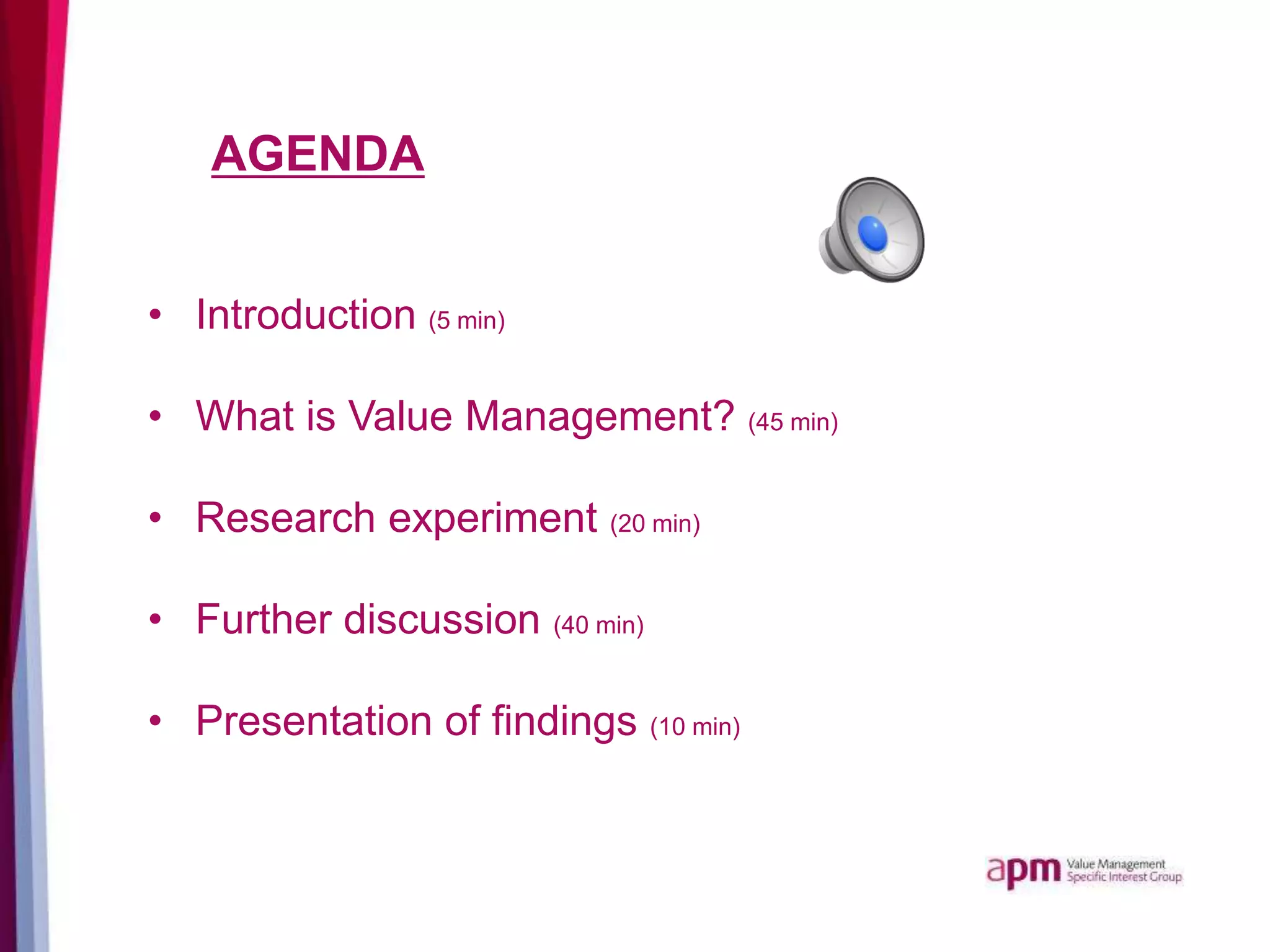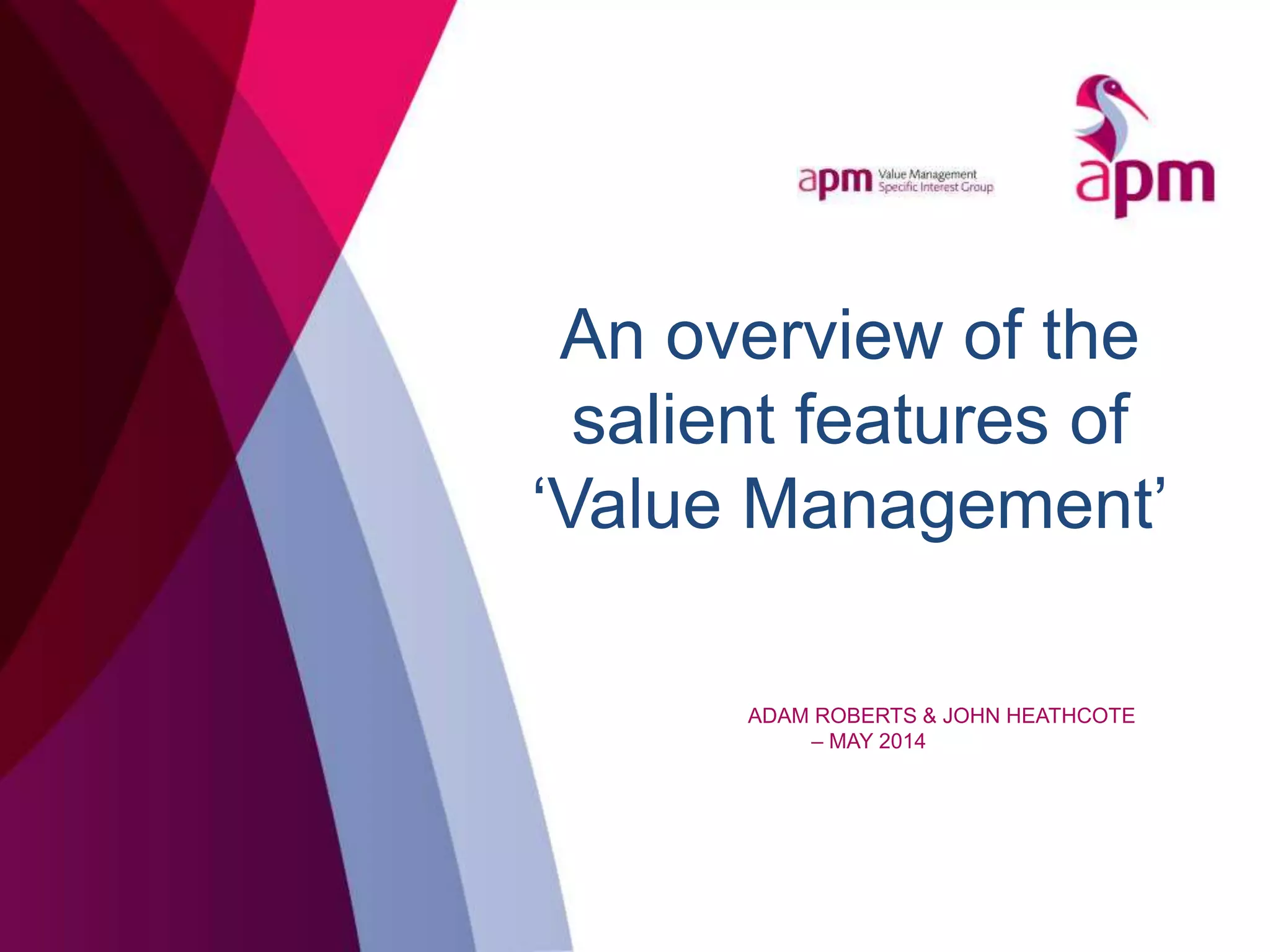 The document provides an overview of value management, emphasizing its origins, definitions, and processes involved in maximizing project value. It outlines the balance between subjective and objective aspects of managing value, importance of stakeholder input, and the structured approach to identifying functional requirements. Additionally, it addresses misconceptions about value management not being a cost-cutting measure but rather a method to enhance overall performance and value.