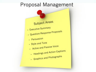 This document provides guidance on key elements of effective proposal writing, including the executive summary, question/response structure, use of active and passive voice, headings, graphics, and photographs. The executive summary should convince readers that the proposed recommendations make sense, differentiate the proposal, and provide expected return on investment. Questions in the request for proposal should be answered thoroughly in the order asked. Active voice is generally preferred unless passive voice hides the actor or emphasizes the receiver. Headings and captions for graphics should be informative and connect features to customer benefits. Graphics should support the proposal message and be introduced in the text before appearing.