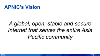 The document provides an update on APNIC's activities and initiatives aimed at fostering a stable and secure internet within the Asia-Pacific region, highlighting membership growth and significant training efforts. It covers key statistics on IPv4 and IPv6 delegations, policy implementations, and collaborations with various organizations to enhance networking capabilities. Additionally, it outlines upcoming conferences and research grants aimed at improving internet technologies and community engagement.