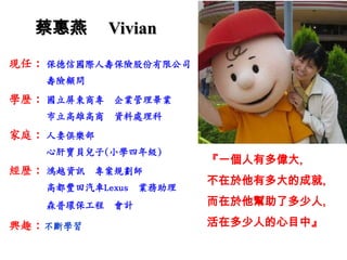 蔡惠燕是一位專業的壽險顧問,於保德信國際人壽工作,並擁有豐富的經歷與多項獎項。保德信金融集團成立於1875年,是美國最大的保險公司之一,以其卓越的財務穩健性和服務客戶的精神而聞名。該公司致力於提供個性化的保險解決方案和專業的客戶服務。