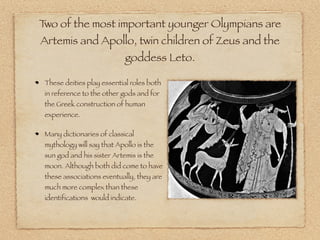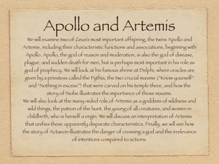 Two of the most important younger Olympians are Artemis and Apollo, twin children of Zeus and the goddess Leto. Apollo is associated with reason, moderation, prophecy, healing and medicine, but also with sudden death. His most important role is as the god of prophecy at the Oracle of Delphi. Artemis is associated with wildness as the huntress and protector of wild animals and women. She brings sudden death to women. The story of Actaeon illustrates that even unintentional violations of boundaries between gods and humans can lead to disaster in Greek mythology.