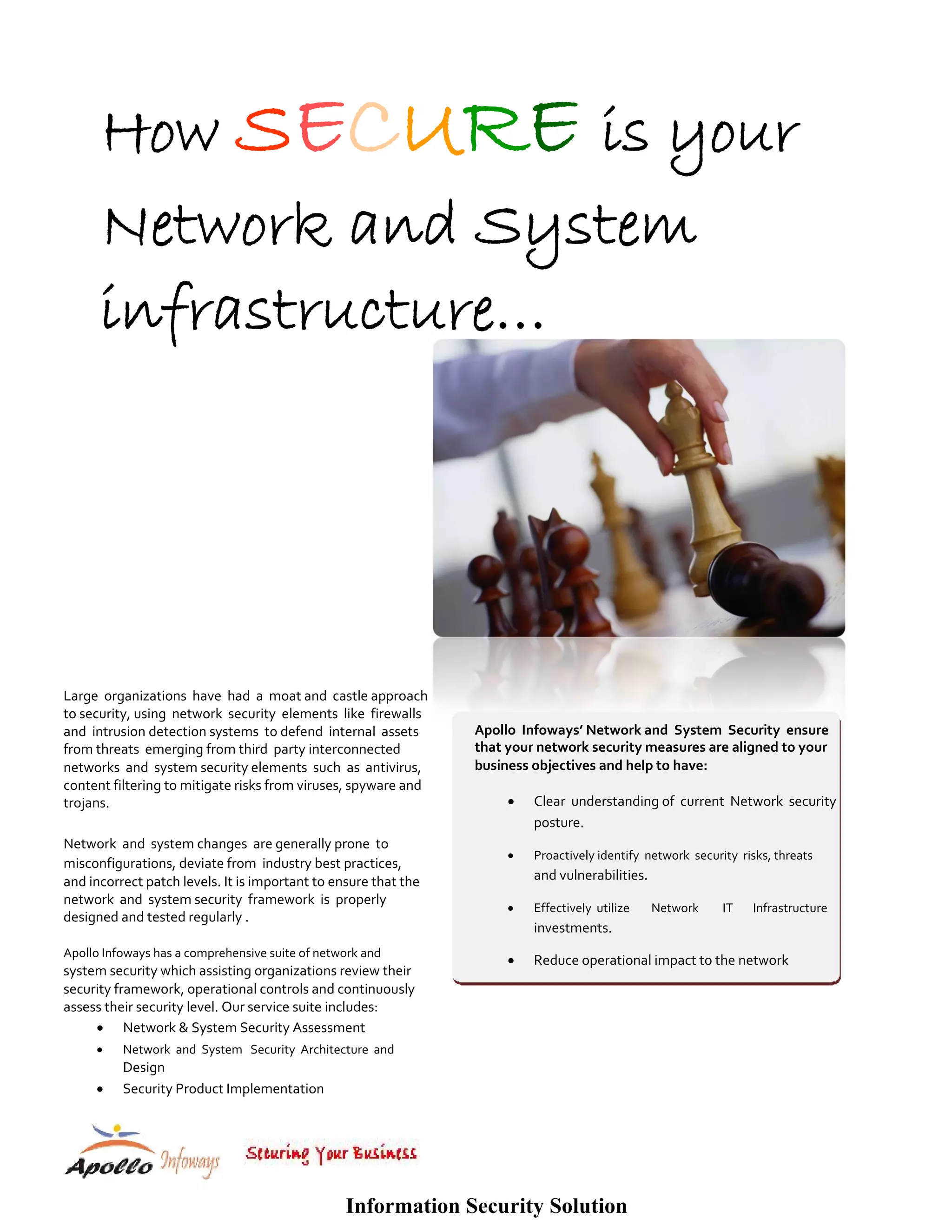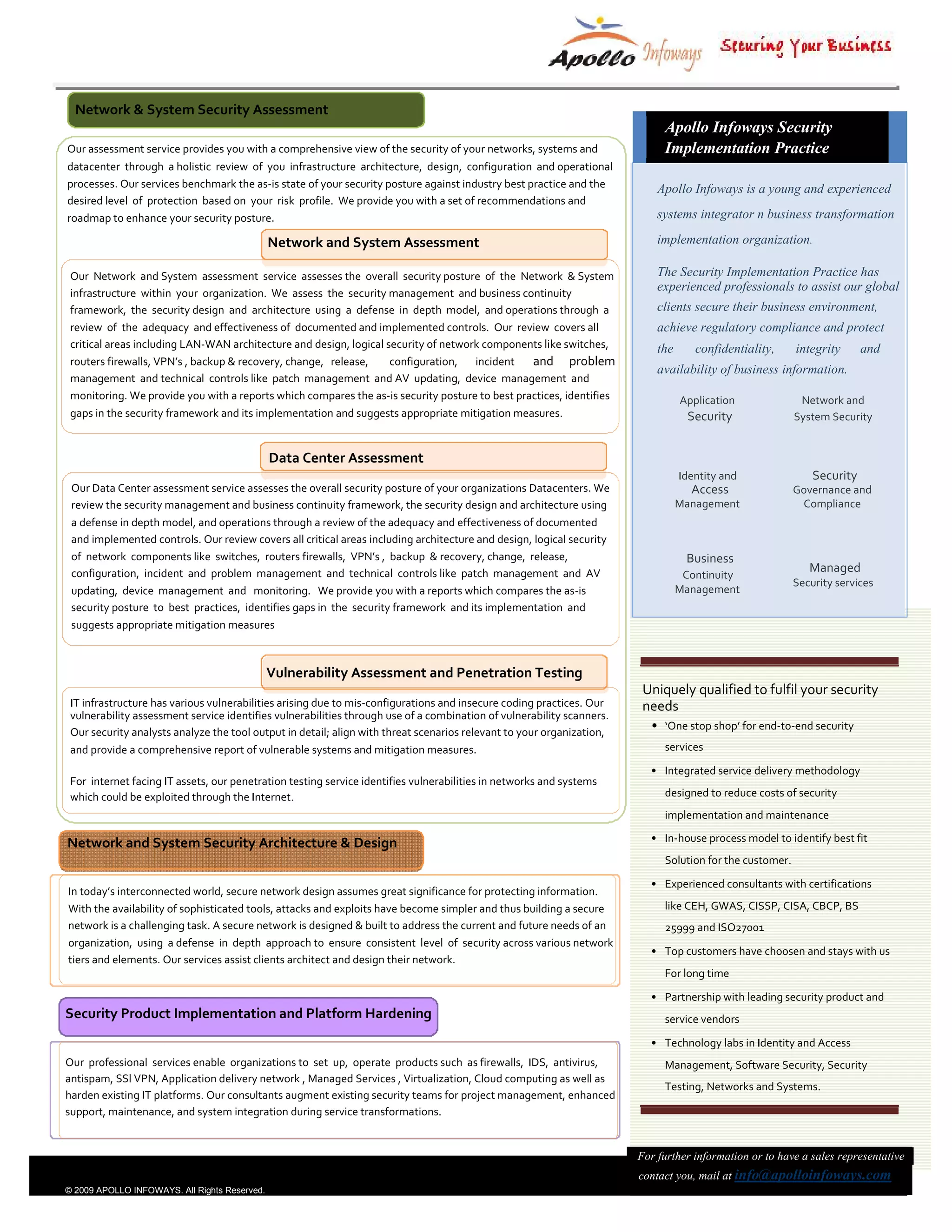 This document discusses network and system security assessment services provided by Apollo Infoways. Their services help organizations understand their current security posture, identify risks and vulnerabilities, and effectively utilize existing network infrastructure investments. Apollo Infoways' assessments evaluate network, system and data center security architectures and controls to identify gaps and recommend improvements aligned with an organization's security needs and business objectives.