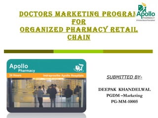 This document summarizes a marketing program submitted by Deepak Khandelwal for Apollo Pharmacy, a large retail pharmacy chain in Asia. The program involved collecting data on customer foot traffic, prescription levels, and satisfaction surveys. Tables show customer visits, sales, and prescription numbers for different Apollo pharmacy locations over three days. A questionnaire was used to collect customer feedback on service quality. Analysis found customers were generally satisfied with staff courtesy and quality of drugs available. Suggestions include improving promotional activities and better understanding demand, supply and competitors.