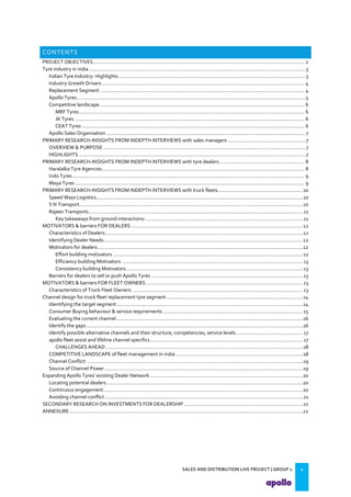 This document provides an overview of the tyre industry in India and Apollo Tyres' position within it. It summarizes insights from primary research interviews with Apollo sales managers, tyre dealers, and truck fleet owners. Key findings include: Apollo follows a fixed discount structure, while competitors offer increasing discounts based on volume; dealers prefer Apollo's structure as it benefits small and large dealers equally. Fleet owners prioritize durability, credit terms, and timely delivery when choosing tyres. The document also outlines motivators and barriers for dealers and fleet owners in selling or purchasing Apollo Tyres. It proposes strategies like expanding the dealer network and conceptualizing a fleet management system to increase Apollo's market share.