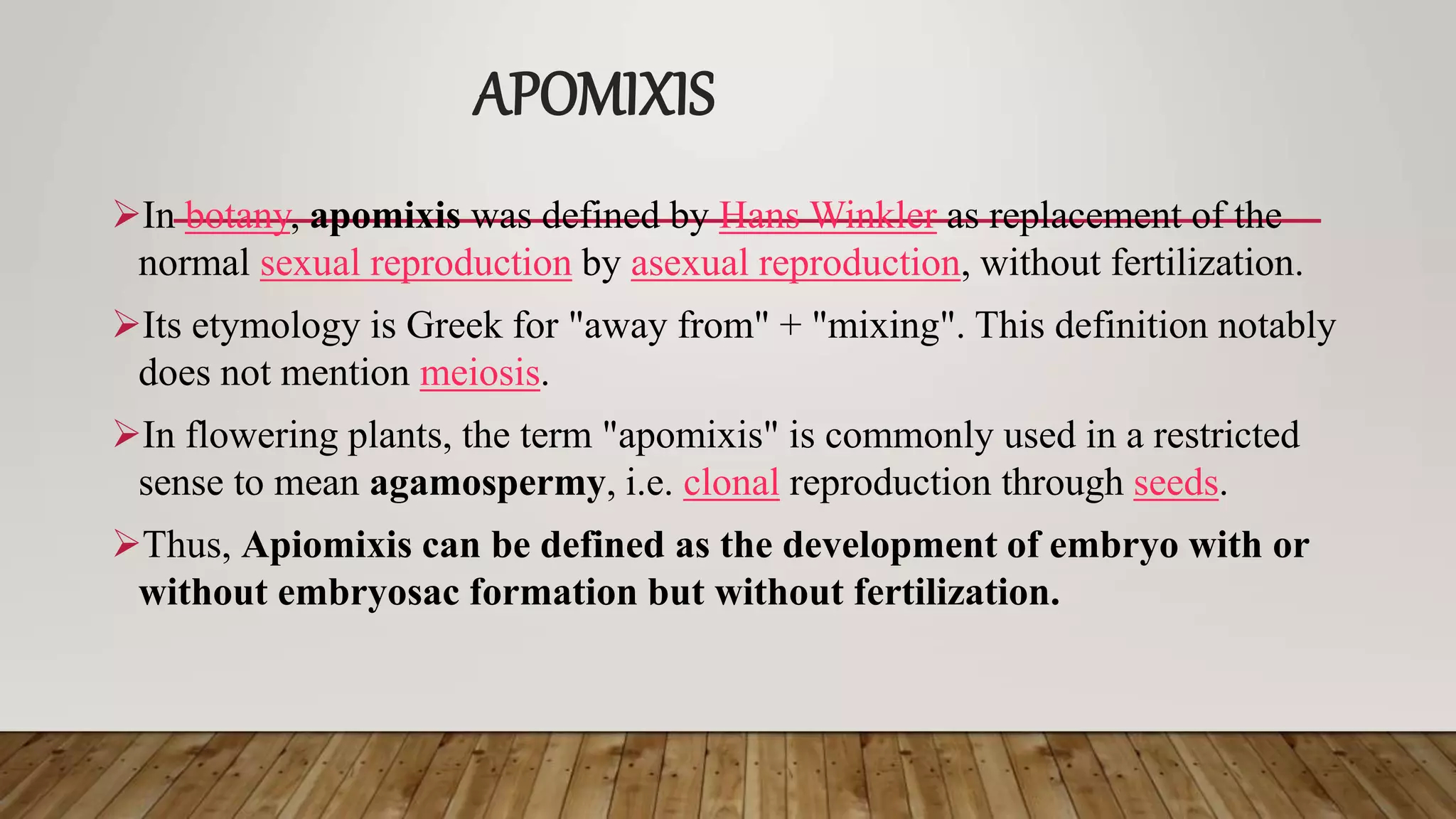 Apomixis in botany refers to asexual reproduction without fertilization, leading to clonal seed development in flowering plants. This process allows plants to bypass meiosis and fertilization, resulting in maternal clones that could enhance agricultural breeding strategies. The document discusses different types of apomixis, including gametophytic, sporophytic, and vegetative apomixis, along with their mechanisms and implications.