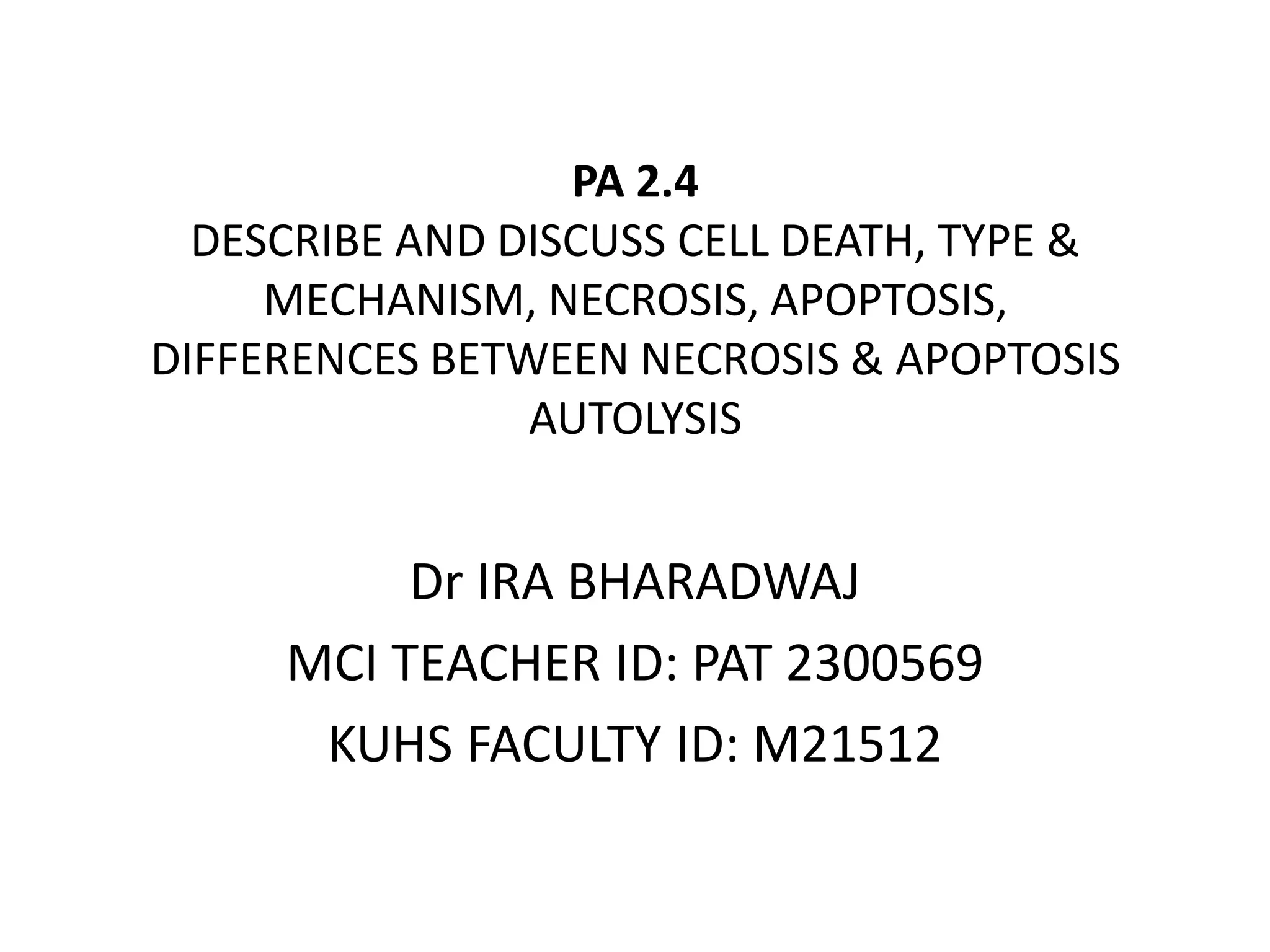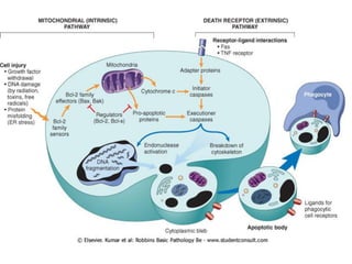 The document discusses various types and mechanisms of cell death, specifically focusing on apoptosis and its differences from necrosis. It outlines the etiology, pathogenesis, and biochemical changes that occur during apoptosis, detailing the pathways involved and the regulatory proteins like caspases. Additionally, it highlights the laboratory diagnostics used for detecting apoptosis, as well as examples and the morphological changes associated with this programmed cell death.