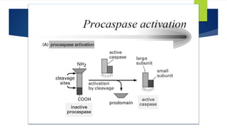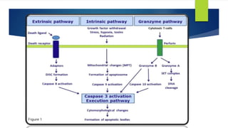 Apoptosis is a controlled, programmed cell death process that is essential for normal development and homeostasis. During apoptosis, cells actively trigger intracellular events that lead to cell fragmentation and phagocytosis without causing inflammation. Apoptosis is distinct from necrosis, which is unregulated cell death caused by external cellular injuries. Key aspects of apoptosis include activation of caspases, DNA fragmentation, and changes to cell membranes that mark cells for phagocytosis. Apoptosis pathways can be triggered by extracellular signals or internal cell damage and are important in development, tissue homeostasis, and diseases like cancer when the process goes awry.
