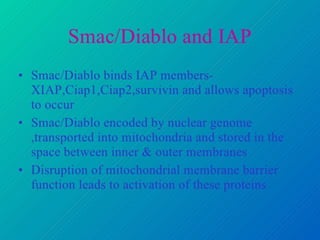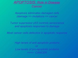 Caspases are cysteine-dependent aspartate specific proteases that cleave target proteins after aspartic acid residues. They exist as inactive zymogens called procaspases in cells and initiate a proteolytic cascade when activated. This leads to cleavage of key proteins and characteristic apoptosis morphology. The Bcl-2 family of proteins regulate apoptosis at the mitochondrial membrane, with pro-apoptotic proteins like Bax activating apoptosis and anti-apoptotic proteins like Bcl-2 inhibiting apoptosis. Many cancers acquire mutations in genes encoding proteins that regulate apoptosis, allowing cancer cells to evade cell death signals and continue uncontrolled proliferation. Targeting apoptosis pathways is a promising strategy for cancer treatment.