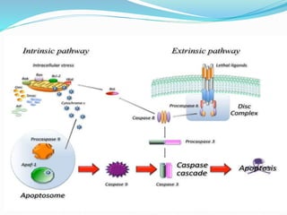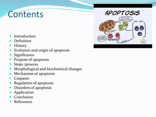 This document provides a comprehensive overview of apoptosis, the process of programmed cell death, detailing its definition, historical development, significance, purpose, mechanisms, and its implications in various disorders. Apoptosis is crucial for maintaining homeostasis and proper development in multicellular organisms, with a significant number of cells dying and being regenerated daily. The document discusses various pathways involved in apoptosis, the role of caspases, and how dysregulation can lead to diseases such as cancer and neurodegenerative disorders.