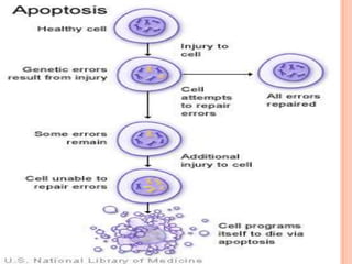 This document summarizes apoptosis, or programmed cell death. It describes how apoptosis involves characteristic cellular changes, including blebbing and nuclear fragmentation. Between 50-70 billion cells die daily in the human body through apoptosis. The process was first described in 1842 and the term "apoptosis" was introduced in 1972. Apoptosis occurs through intrinsic and extrinsic pathways, and involves caspase proteins. It plays an important role in development, the immune system, and maintaining tissue homeostasis.