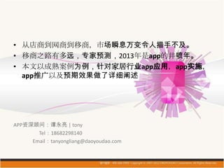 该文档讨论了家居行业在3G时代中app的发展与应用,强调了app作为现代商业的重要工具。具体探讨了家春秋app的功能和市场定位,包括品牌宣传、商品展示及会员管理等一体化解决方案。文中还提到,app的普及将为企业带来新的客户和更好的用户体验。
