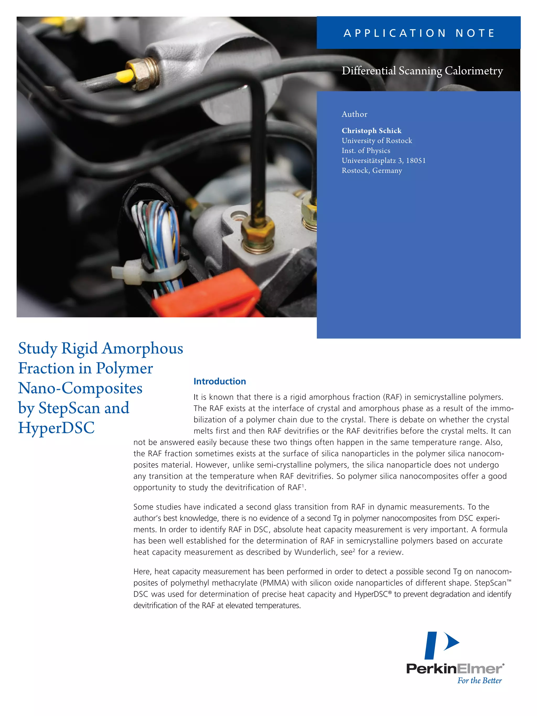 The document discusses the analysis of the rigid amorphous fraction (raf) in polymethyl methacrylate (PMMA) silica nanocomposites using differential scanning calorimetry (DSC) to explore the devitrification behavior. Results indicate that the strong interaction between silica nanoparticles and PMMA prevents raf devitrification prior to polymer degradation, and no evidence of a second glass transition was observed. The findings suggest that in semicrystalline polymers, rigid crystals must melt before raf can relax and devitrify.
