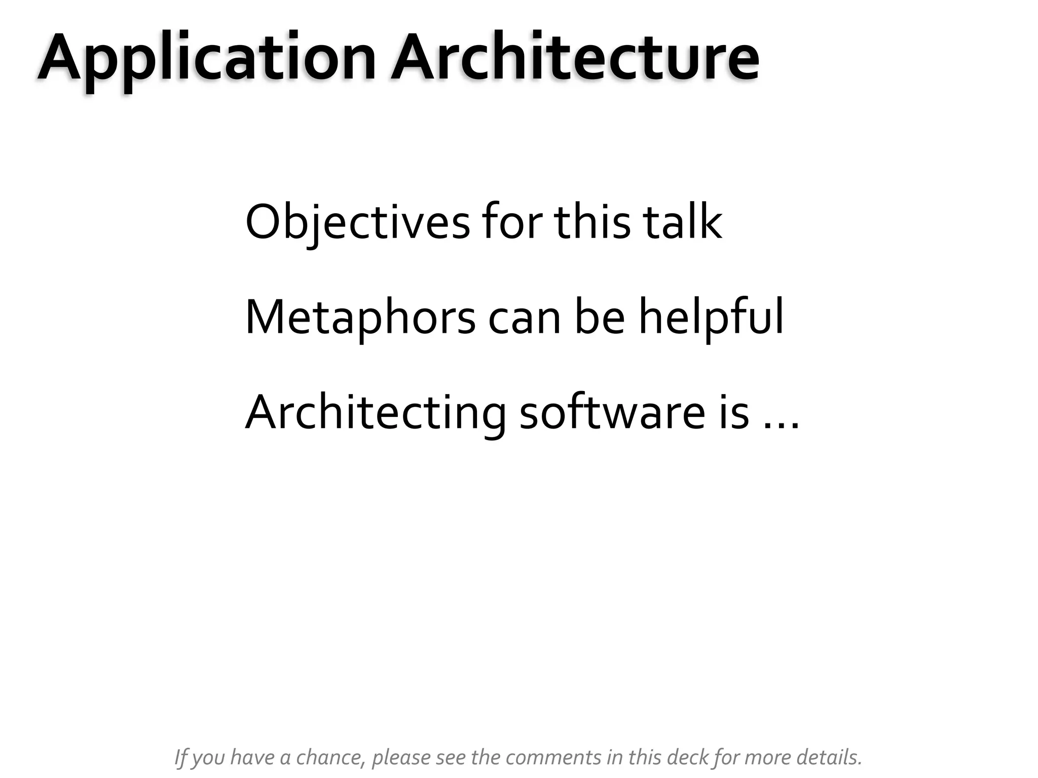 The document discusses application architecture and outlines a 5-step method for architecting software applications. It covers establishing goals and principles, understanding the architectural landscape of different application and style types, and evaluating quality attributes. The 5 steps of the method are to: 1) identify objectives, 2) choose a key scenario, 3) create an application overview, 4) test against quality attributes, and 5) build a candidate architecture. The overall goals are to apply fundamental principles like separation of concerns and choose appropriate application types, styles, and technologies to meet objectives.