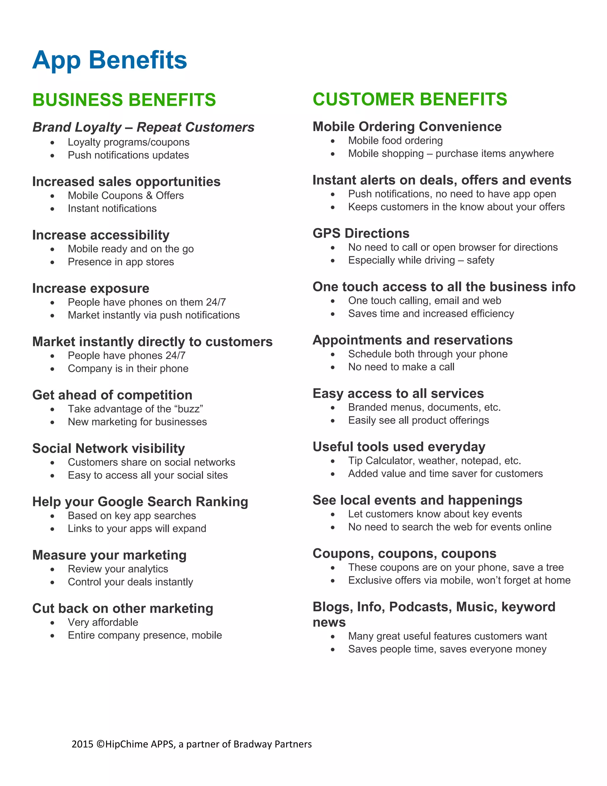This document outlines the benefits of developing a mobile app for businesses and customers. For businesses, an app can increase brand loyalty, sales opportunities, accessibility, exposure, and help cut back on other marketing costs. It also allows businesses to market directly to customers and measure the effectiveness of their marketing. For customers, a business app provides conveniences like mobile ordering and alerts, GPS directions, one-touch access to business information, and useful tools. It also allows easy access to coupons, deals, events, and other content.