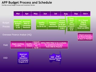 First, budget allocations and campaign revenue instructions are sent out in March. Then, quality checks are performed on budget preparations from May through June. Budgets are then prepared, reviewed by executive leadership, and presented to the Board in September for approval. Overseas analysts then verify the accuracy of the approved Board budget.