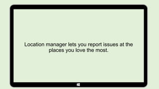 Location manager is an app that allows users to report issues they notice at places like offices, parks, and schools by filing a report on their smartphone with a photo and location. The report is then sent to the person responsible so they can resolve the issue. The app brings users and location managers closer together to improve places by allowing easy reporting and tracking of unresolved issues.