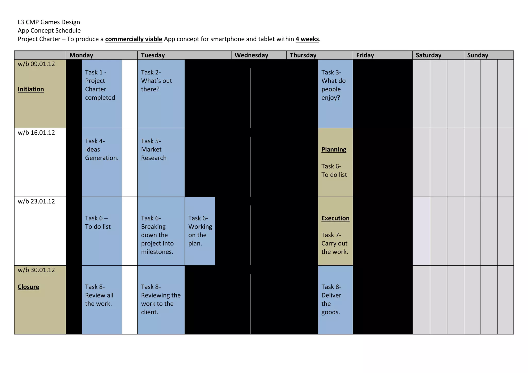 The document outlines an app concept project schedule to develop a commercially viable app within 4 weeks. It involves 8 tasks over 4 weeks, including initiating the project, researching existing apps and user interests, generating app ideas, developing a project plan and milestones, executing the work, and delivering the final app concept to the client.
