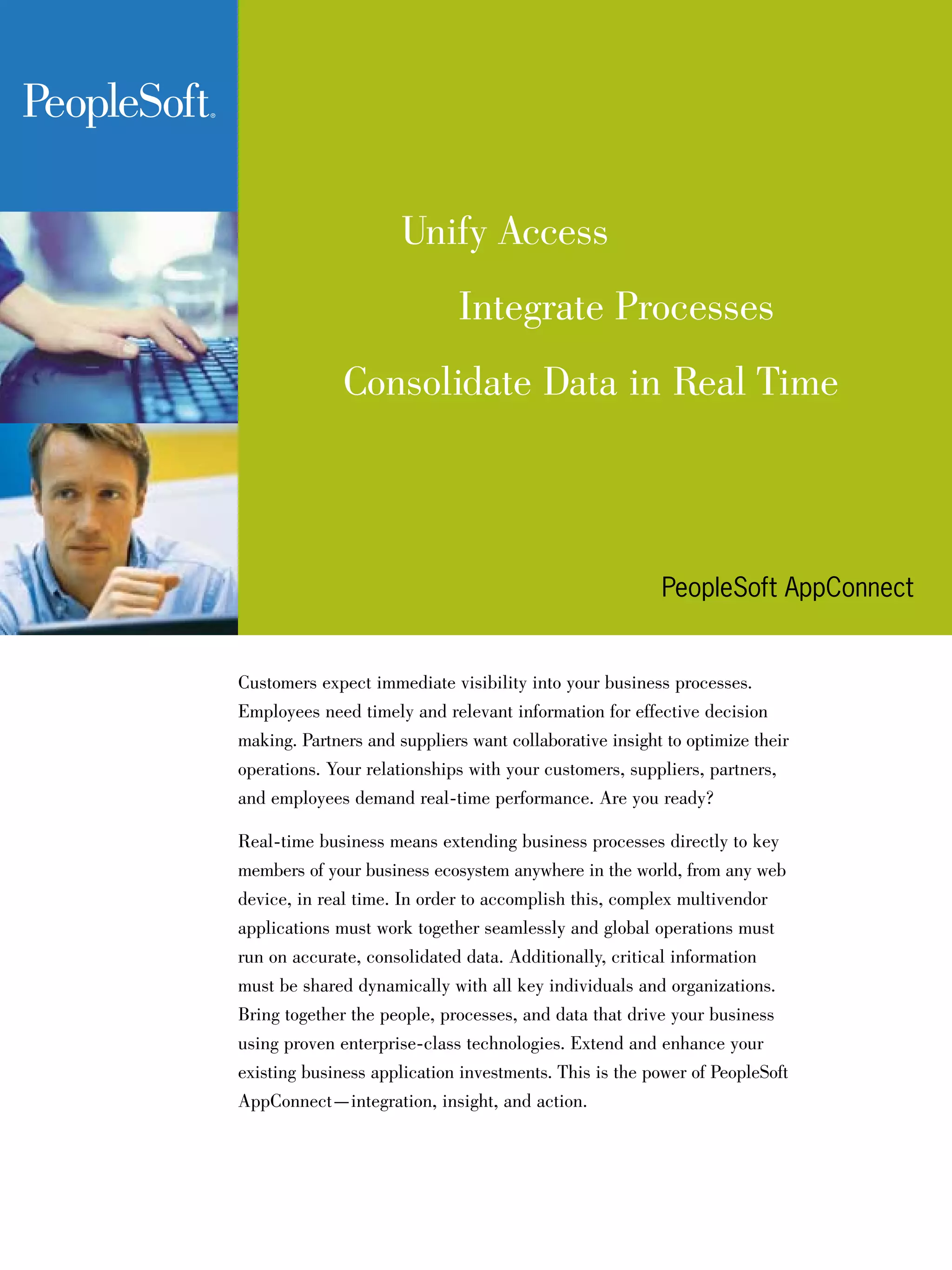 The document discusses PeopleSoft AppConnect, which allows users to integrate business applications, unify global business processes, and consolidate data in real time. It does this through the PeopleSoft Integration Broker, which connects business applications and allows data to be transformed and routed between systems. The Integration Broker uses pre-built connectors and understands synchronous and asynchronous messaging to seamlessly integrate systems.