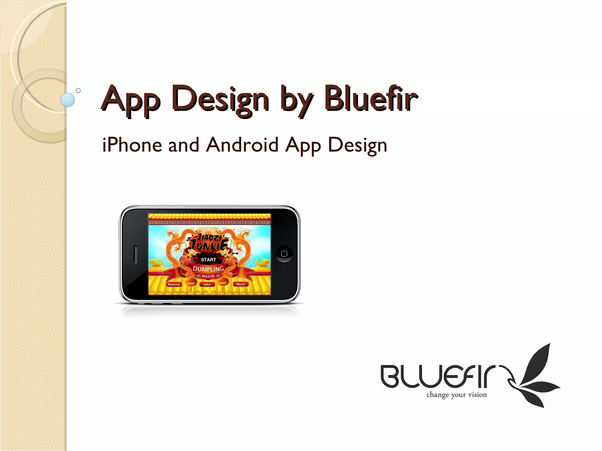 The document discusses app design by Bluefir for iPhone and Android platforms, highlighting the features and applications available for each device. It provides an overview of the iPhone as a smartphone designed by Apple, followed by information on the Android operating system from Google. Bluefir specializes in creating high-quality applications for both platforms, offering competitive pricing and a dedicated team for development.