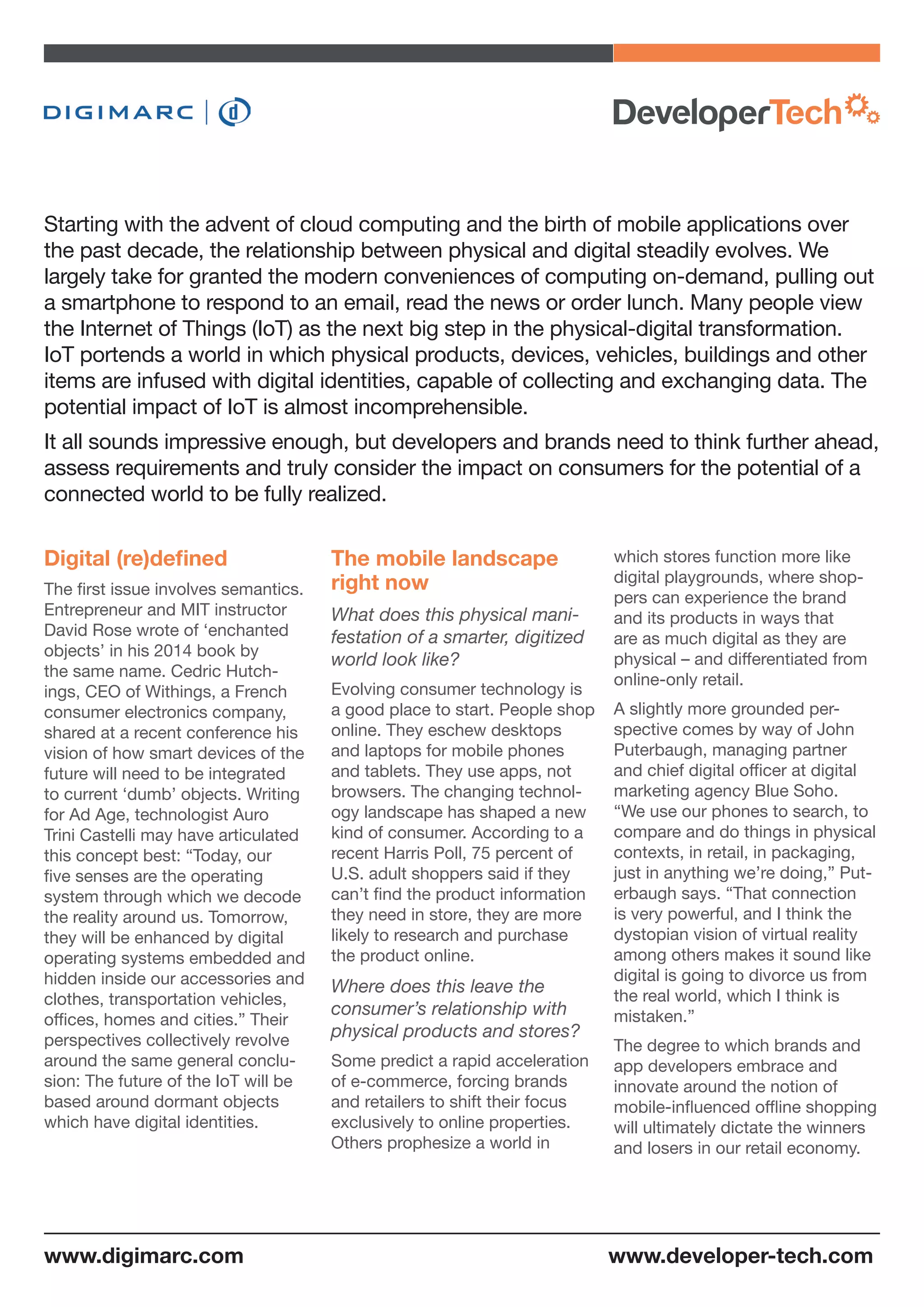 The document discusses the future of retail, focusing on how app developers and the Internet of Things (IoT) will transform consumer interaction with physical products. It emphasizes the need for effective mobile technologies that seamlessly integrate digital identities into everyday objects, enhancing consumer experiences without disrupting the natural connection to physical goods. Key to this evolution is the development of more intuitive, reliable, and comprehensive automatic identification systems that improve engagement and convenience for consumers.