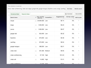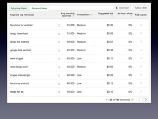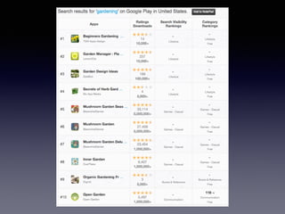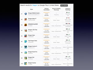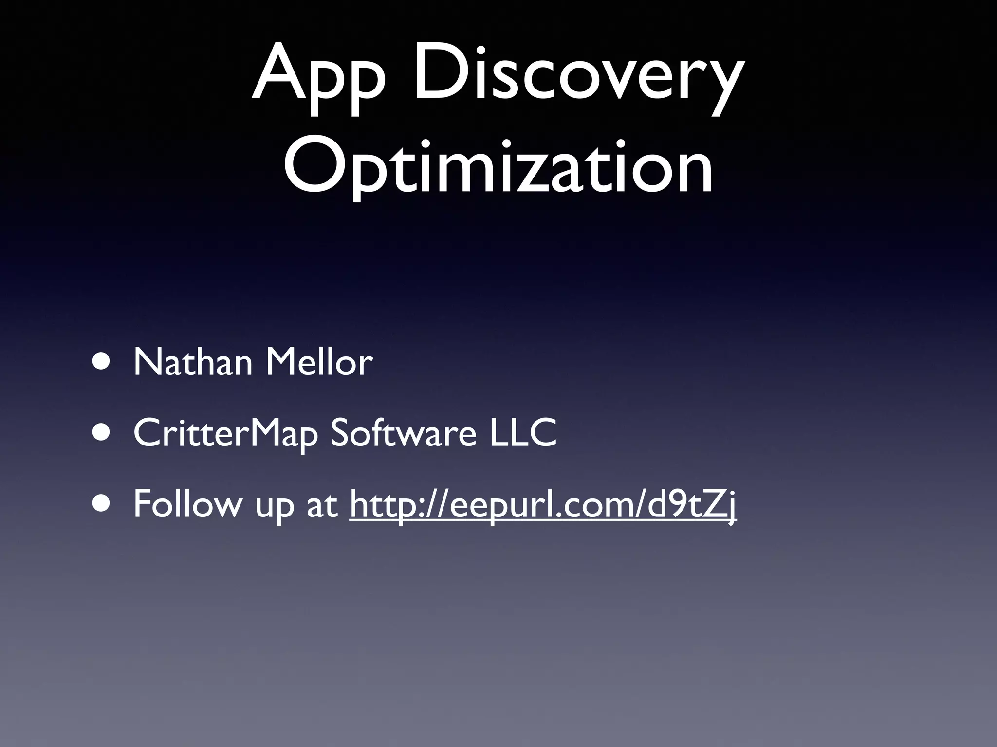 The document discusses optimizing apps for discovery through search engine optimization techniques. It covers conducting keyword research to find relevant search terms, optimizing app metadata like the title and description for keywords, and using keywords effectively in paid promotions and other marketing efforts. Tracking keywords is also discussed to measure success and refine optimization strategies.