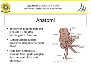 Dokumen tersebut membahas tentang appendisitis akut. Appendisitis akut adalah peradangan pada usus buntu (appendiks) yang terletak di perut bagian kanan bawah yang memerlukan tindakan bedah segera untuk mencegah komplikasi. Gejala umum appendisitis akut antara lain nyeri perut, mual, demam, dan leukositosis. Pemeriksaan fisik akan menunjukkan nyeri dan defens muskuler di daerah McBurney. Diagnosis
