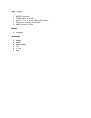 The AppHome Management Module is a crucial application for users looking to enhance their business through mobile advertising. It offers features like SMS and email invitations, third-party ad network integration, and personalized ads, all while maintaining a categorized view of the apps. Built with technologies such as PhoneGap, HTML5, and jQuery, it aims to improve transparency in mobile advertising.