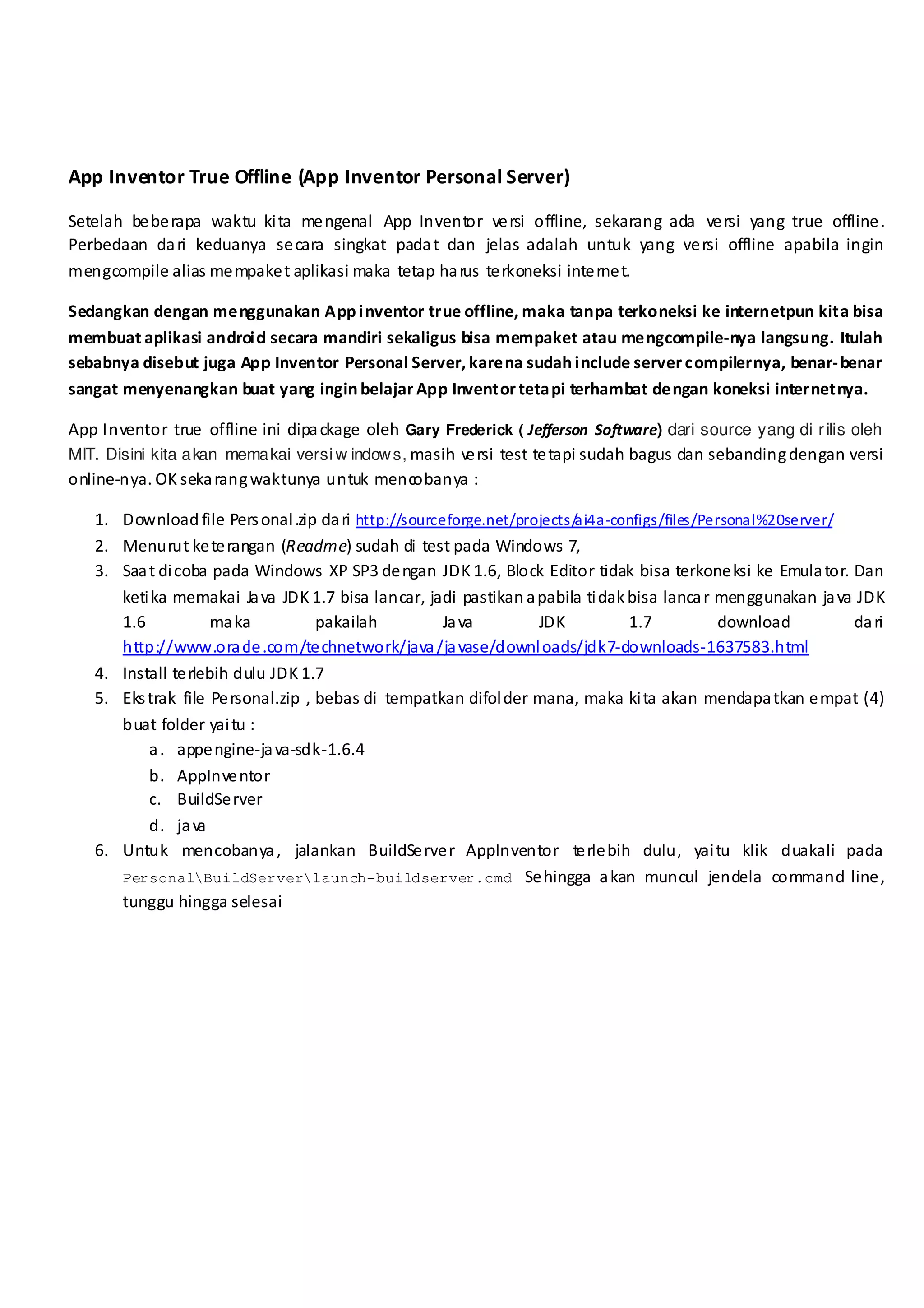 App Inventor True Offline memungkinkan pengguna untuk membuat dan mengcompile aplikasi Android tanpa koneksi internet, berbeda dengan versi offline sebelumnya yang masih memerlukan internet. Paket ini dikembangkan oleh Gary Frederick dan menggunakan server kompilasi yang sudah terintegrasi. Pengguna disarankan untuk menggunakan JDK 1.7 untuk memastikan kinerja yang lancar.