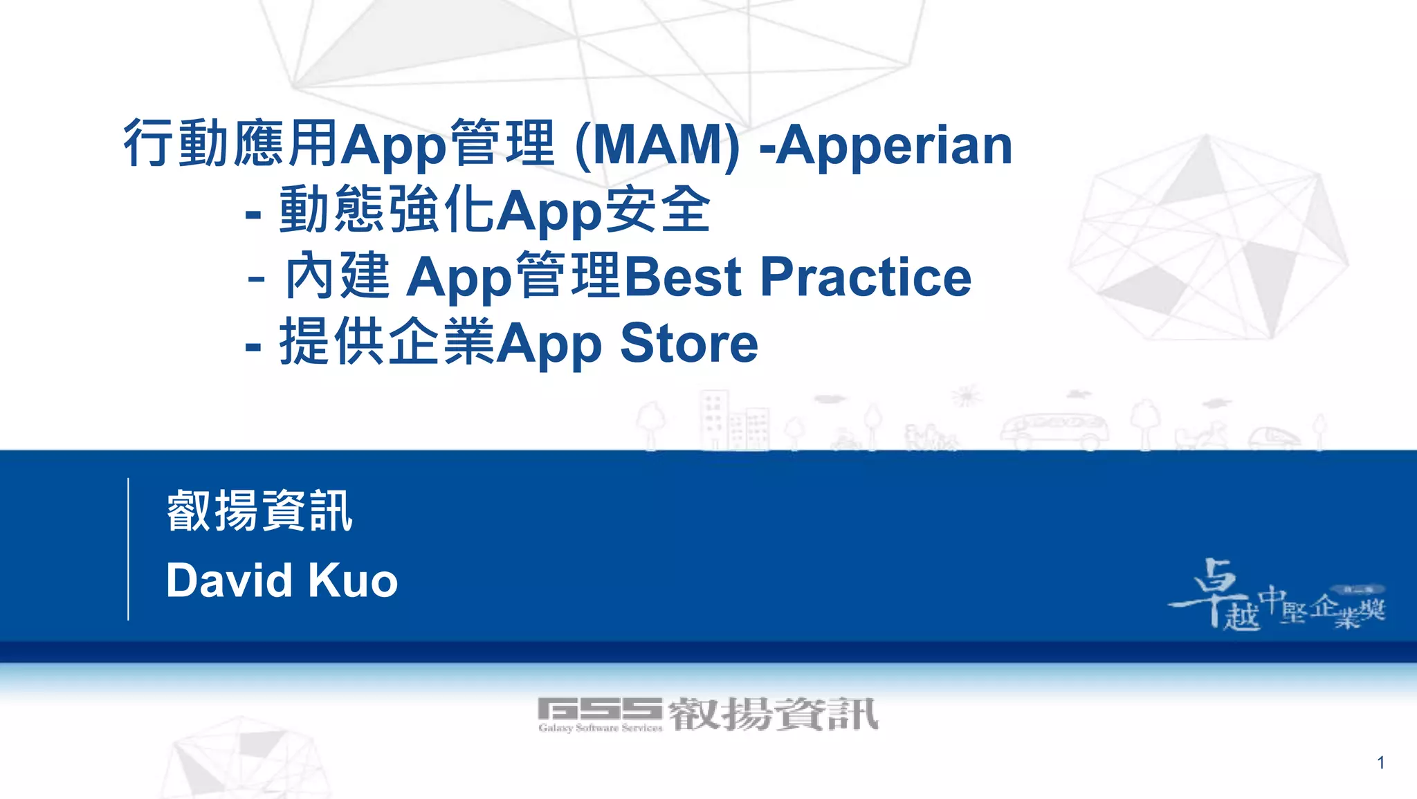 Apperian provides a mobile application management (MAM) platform that offers dynamic app security, built-in app management best practices, and an enterprise app store. It uses a cloud-based architecture to securely manage apps across different mobile devices. More than 130 companies and government agencies use Apperian, with over 525,000 total users. On average, each enterprise user manages around 4,000 other users through the Apperian platform, which has deployed over 2.5 million apps. Apperian's MAM platform focuses on app-level security and management without requiring mobile device management (MDM).