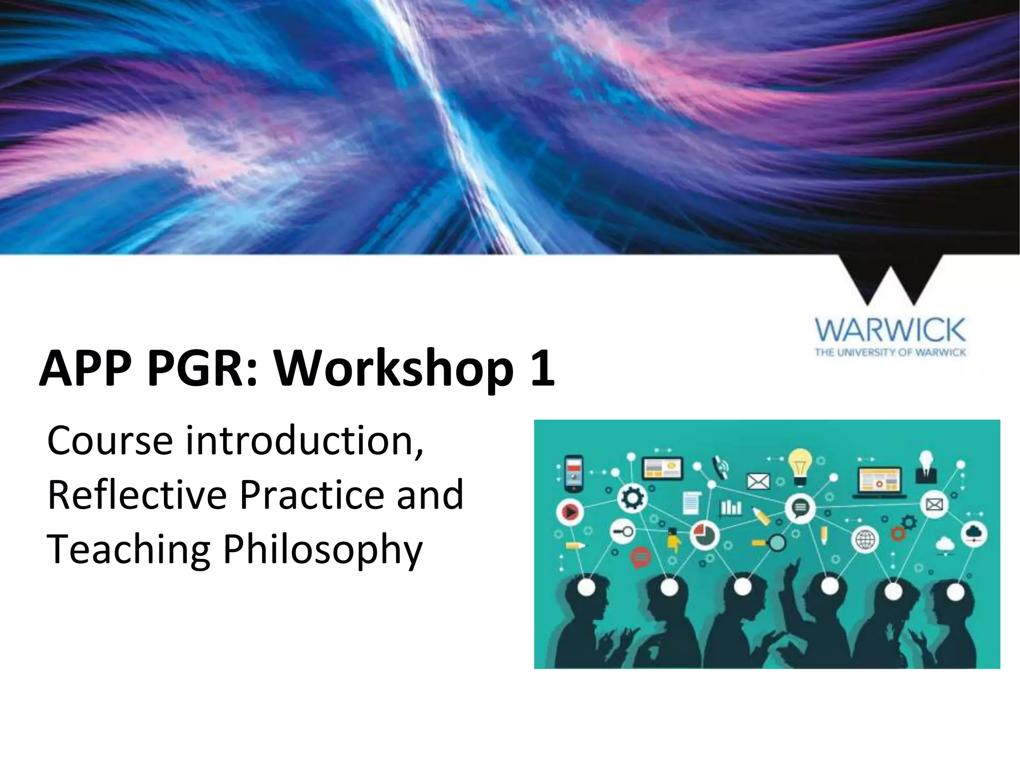 - The document provides an overview of Workshop 1 of the APP PGR course which covers course introduction, reflective practice, and developing a teaching philosophy.