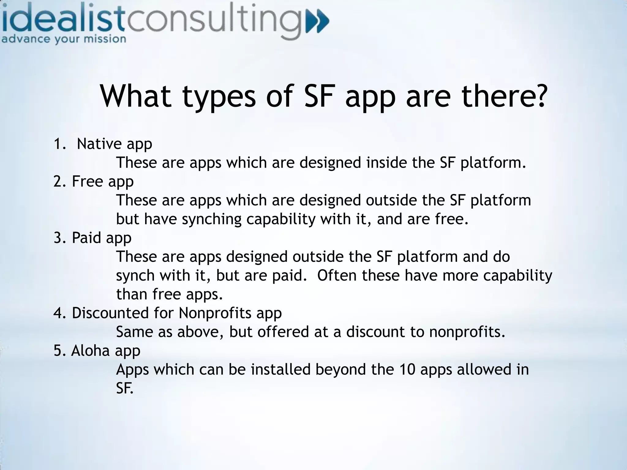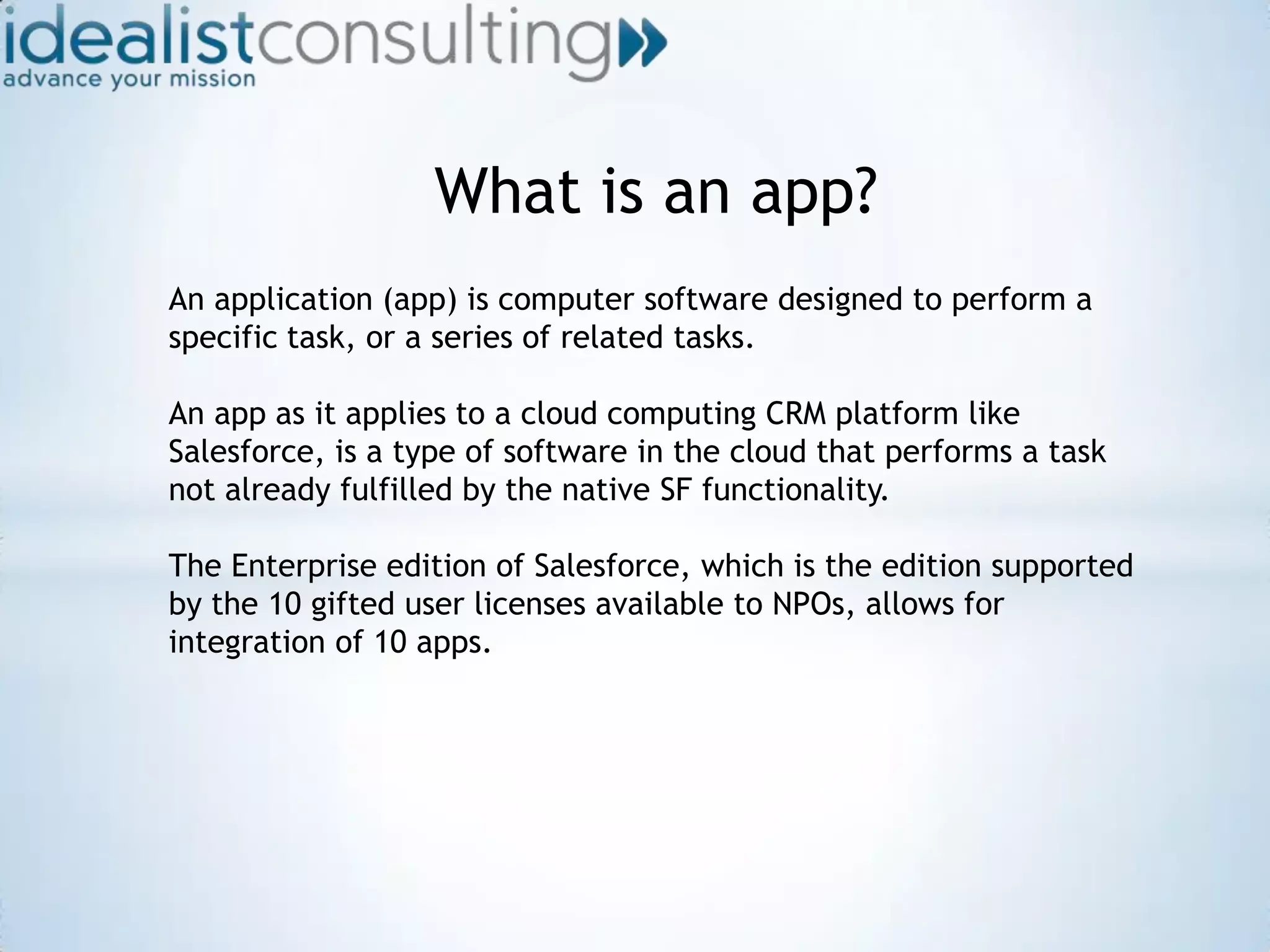 An app is software designed to perform specific tasks within a cloud computing platform like Salesforce. In Salesforce, apps extend its functionality by allowing customization for specific organizational needs. The main types of apps are native, free, paid, and discounted for nonprofits. Apps optimize Salesforce by enabling features it does not have natively, like allowing unlimited mass emails with customization options. The AppExchange is a site where users can find, review, test, and purchase apps to implement within their Salesforce instance. Some top apps for nonprofits include Vertical Response for mass emails, Demand Tools for data management, and Acteva RSVP for event registration.
