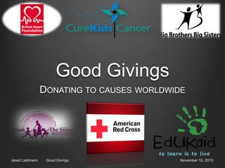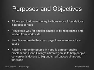 Good Givings is an app that allows users to donate money to thousands of foundations and causes worldwide. It provides a way for smaller charities to gain recognition and funding. The app aims to help people conveniently donate to large and small causes through an easy-to-use search and donation process. It features tools like translators, charity categories, and organization profiles to help users donate internationally. The app also includes a rewards program where users earn points for donations that can be redeemed for merchandise.