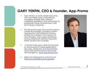 Gary Yentin, CEO of App-Promo, gave a presentation on the secrets to becoming a number one app. He discussed the challenges of discovery and monetization in the crowded app marketplace. Yentin also presented data from App-Promo's developer survey showing that experienced developers who stick with their apps long-term are more likely to find success, earning over $500,000 in some cases, compared to new developers. The presentation provided strategies for app store optimization, pre-launch marketing, social media promotion, and paid mobile ads to help apps gain discovery and engagement.