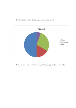 The document was a questionnaire about mobile apps. It asked respondents about their favorite type of app (with most choosing Game), their specific favorite app (with Angry Birds and Cut the Rope being popular choices), what they liked about that app (with Fun and Pass the time being common reasons), and what type of new app they would want developed (with Game and Education being popular choices for new app types).